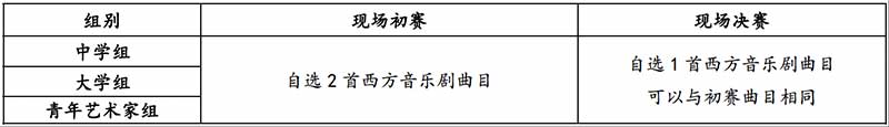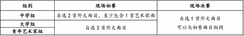 (1)现场初赛:各组别初赛演唱2 首曲目;