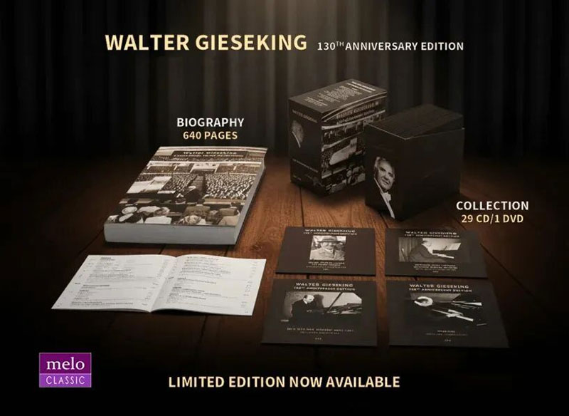 为纪念钢琴大师瓦尔特·吉泽金(walter gieseking, 1895—1956)诞辰130周年,长久以来致力于历史录音的发掘与出版的melo classic品牌,在经过长期系统地收集、整理和修复后,于近期将这位钢琴大师于上世纪30—50年代留下的一系列音乐会实况和广播录音结集发行。这套由29张cd和1张dvd组成的合集,是对吉泽金全盛时期演奏艺术的一次全景式回顾。与这些录音一起出版的,还有一本史料详实的吉泽金传记,此书对他的音乐生涯与艺术成就进行了全面且深入的探索。