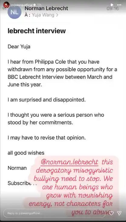 上述关于访谈安排的邮件中,莱布雷希特表达了对王羽佳多次推迟、最终退出BBC访谈节目《莱布雷希特访问》(The Lebrecht Interview)的不满。他以并不温和的方式表达自己的“惊讶”“失望”,表示“我曾以为你是那种会信守承诺的正经人“,直言要“重新评估对你的看法”。