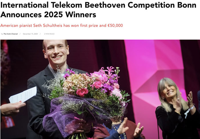 2025年12月13日晚,第11届德国波恩贝多芬国际钢琴比赛在贝多芬故乡波恩圆满落幕。25岁的美国钢琴家塞思·舒尔泰斯(seth schultheis)夺得本届比赛冠军,并同时获得室内乐奖;以色列钢琴家阿米尔·罗恩(amir ron)获得第二名及观众奖;德国钢琴家乔纳斯·史塔克(jonas stark)获得第三名及当代作品奖。