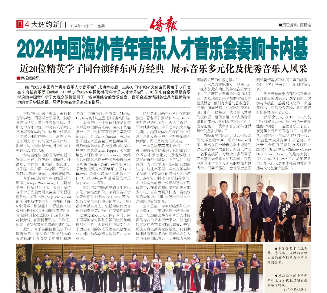侨报纽约10月7日报道,继“2023 中国海外青年音乐人才音乐会”成功举办后,“2024 中国海外青年音乐人才音乐会”于10月6日晚在卡内基音乐厅 Zankel Hall 成功举办。