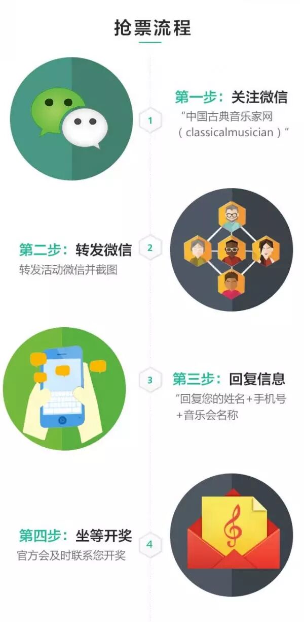 “我爱古典”赠票活动 参与活动的音乐会场次、截止时间以微信通知为准 获奖名单于活动结束次日在微信公众订阅号:中国古典音乐家网(classicalmusician)公布! 音乐会系列微信赠票活动强势来袭啦!为了回馈广大关注中国古典音乐家网微信公众订阅号朋友们的支持,我们与音乐厅和演出主办方合作,将不定期的开展“我爱古典”赠票活动,通过抽奖赠票的形式,给朋友们送去福利。通过这个活动,也希望让更多的人走进古典音乐的世界,享受古典音乐的魅力,爱生活、爱古典音乐。 活动期间内有效回复的客户均有机会参与抽奖。 您需要关注赠票活动单位的微信公众订阅号,成功转发音乐会图文信息。发送您转发的截屏+姓名+手机号+音乐会名称到“中国古典音乐家网(classicalmusician)”微信公众订阅号。 获奖粉丝将收到微信公众订阅号回复的取票代码,凭取票代码和本人身份证到音乐会现场售票处取票。 活动截止后进行抽奖,每个活动场次音乐会抽出一定数量的幸运粉丝,获赠本场音乐会门票,每名粉丝每场音乐会仅限1张。 买票容易,赠票不易!不要再等了!快来抢赠票吧! 请关注音乐会的观看地点!