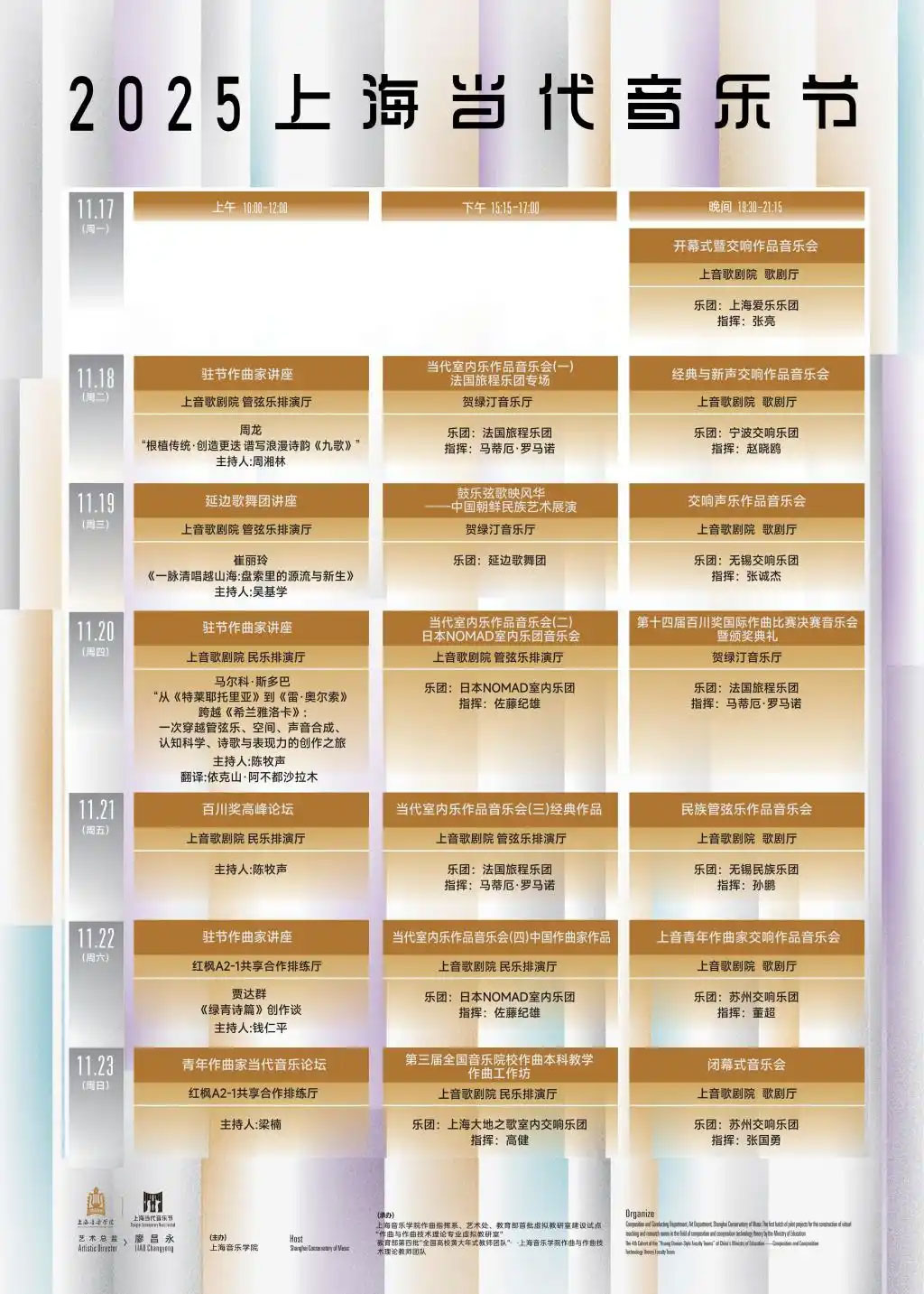今年的音乐节包括5场交响作品音乐会、1场民族管弦乐作品音乐会、4场室内乐音乐会、6场学术讲座与论坛,以及“百川奖”国际作曲比赛决赛音乐会、全国本科作曲教学工作坊。
