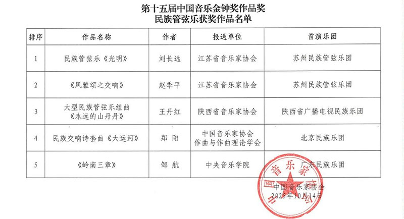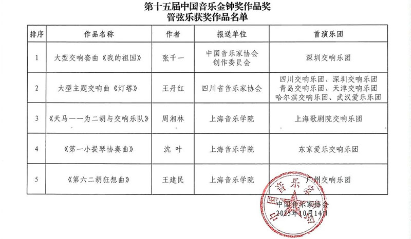 附:第十五届中国音乐金钟奖作品奖获奖名单