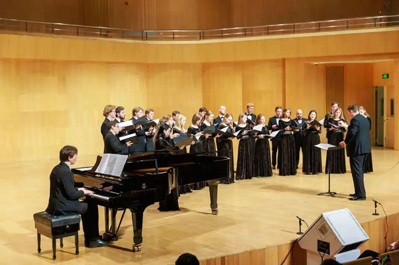 11月12日,俄罗斯格涅辛音乐学院“Altrocoro”现代合唱团带来“为伟大的胜利而歌”专场音乐会,雷仁斯基院长亲自执棒,用经典战争题材与现代合唱语言的融合表达,传递对和平的珍视。11月13日,两校合唱团联合登台,既展现各自民族艺术底蕴,更联袂献唱中俄双语作品,将艺术周氛围推向高潮,赢得现场观众一致赞誉。