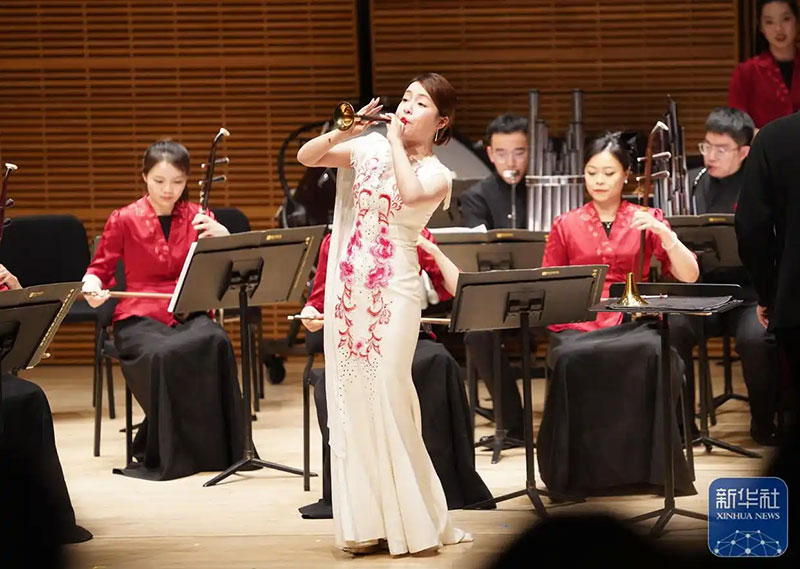 ↑2月24日,在美国纽约卡内基音乐厅,唢呐演奏家刘雯雯(中)在“金钟之星”中国新春音乐会上表演。