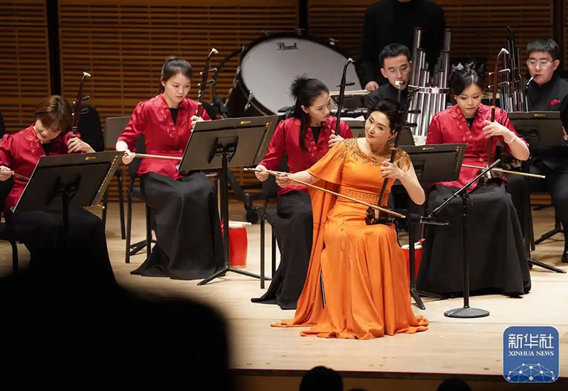 ↑2月24日,在美国纽约卡内基音乐厅,二胡演奏家于红梅(前)在“金钟之星”中国新春音乐会上表演。