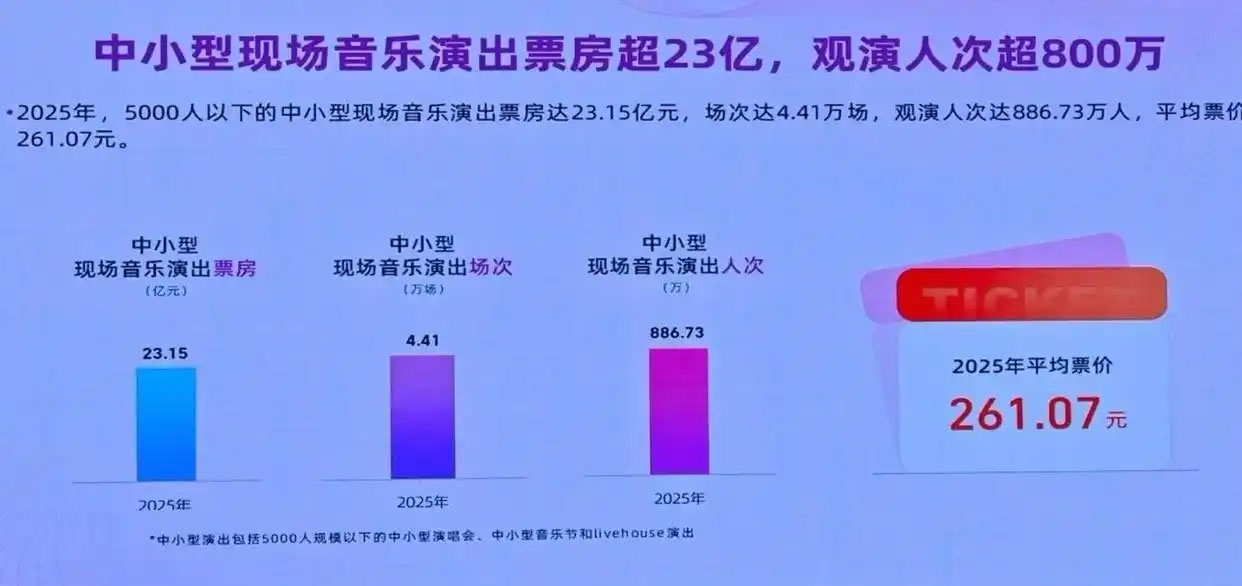 值得注意的是,中国演出行业协会、灯塔专业版历年推出的音乐演出报告中,今年首次将5000人以下的中小型演出数据单独总结提出。2025年,此类中小型音乐演出票房23.15亿元,场次4.41万场,观演人次达886.73万,平均票价261元。业界认为,中小型演出成为音乐演出市场上不可忽视的全新力量,“这23亿元的票房,不仅仅是大型演出的规模补充,也是新生力量的蓄水池,它在培育走向大型场馆的艺人,也在培育下一代年轻观众。”王舒说道。
