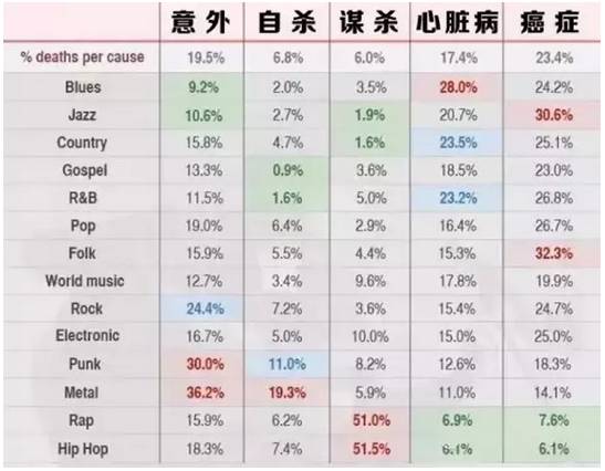 2、每一种音乐风格的艺人死亡原因: