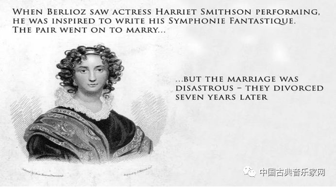 当柏辽兹看到女演员哈里特史密森表演时,他受到启发写下他的Symphonie幻想曲。两人随后结婚......但婚姻是灾难性的 - 七年后他们离婚了。