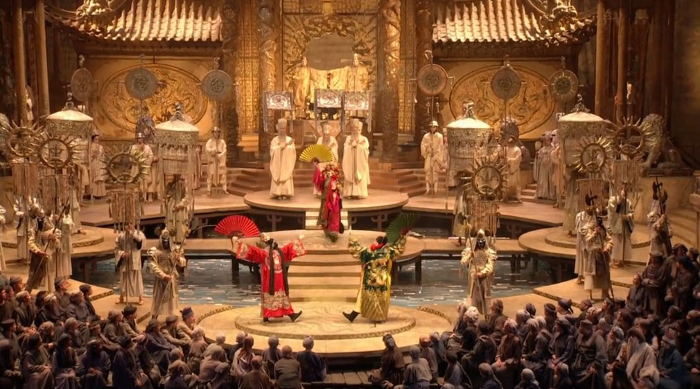这部歌剧在西方人看来新鲜,在中国人看来也新鲜。如今纽约的大都会歌剧院里已经不乏中国人,可是歌剧的布景道具仍然保留着100年前西方人对东方的天真想象:宫廷里表演的是打着伞的日本艺伎,皇帝穿着县令的官服,灰头土脸的中国人一个个都像极泥人张,而且他们以为中国人都生活在京剧或皮影戏里。